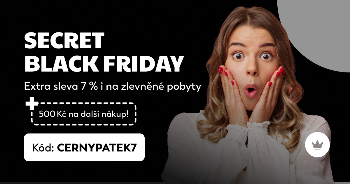 jste první, kdo se dozvídá o tajné Black Friday slevě! S kódem CERNYPATEK7 získáte 7 % slevu na úplně všechny pobyty z naší nabídky.