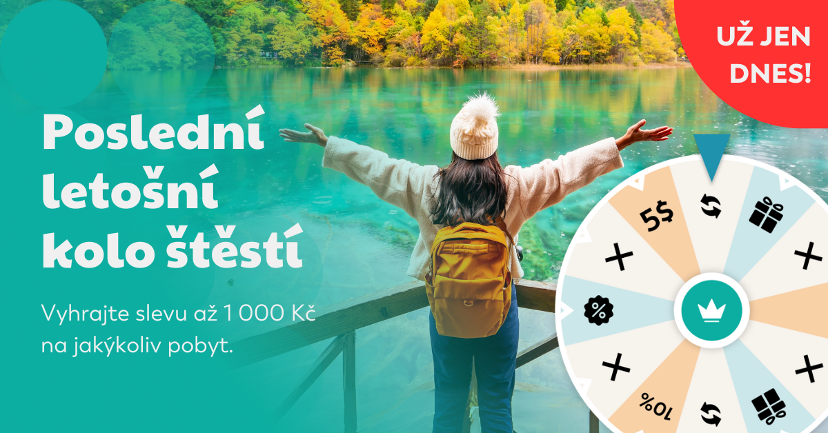 jen do dnešní půlnoci si můžete v kole štěstí vytočit až 1 000 Kč na dovolenou. Extra sleva platí na jakýkoliv pobyt, a to i na akční nabídky (s výjimkou Slevy dne).